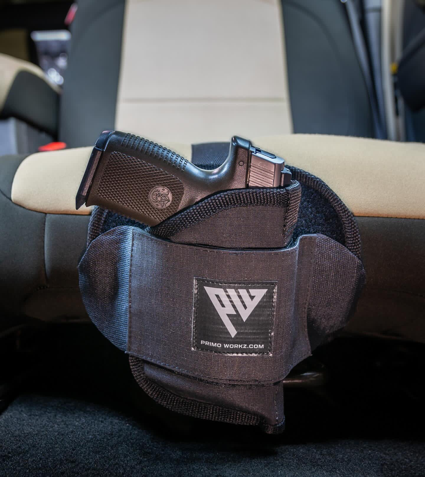 The Primo Workz Gun Seat Holster is a universal vehicle-mounted holster designed for safe, secure, and accessible firearm storage. It slips securely over your seat without tools or permanent modifications. The ergonomic design keeps your handgun within reach while driving or parked, making it ideal for hunters, outdoor enthusiasts, and anyone who needs quick access and peace of mind.